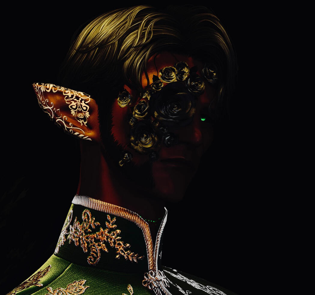 -NOTABLE TRAITS- Droopy Pointed Ears, unmarred pale skin, stiff, porcelain and gold left hand